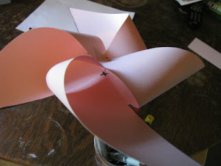 Directions here will make pinwheels about a foot across. Smaller paper squares will make smaller pinwheels.